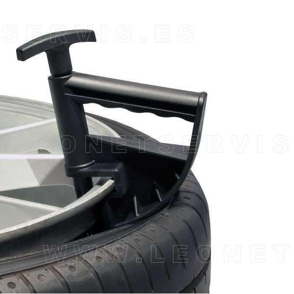 Esta herramienta es especialmente útil debido a que mantiene el talón del neumático en la garganta de la llanta haciendo que el montaje sea mucho más fácil para los profesionales del taller.