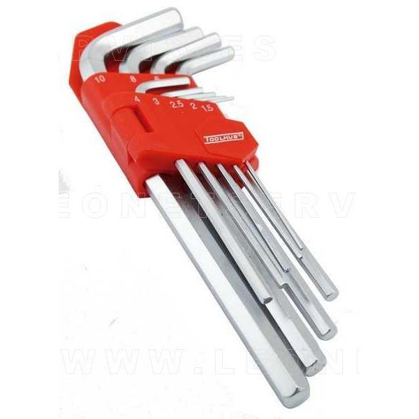 Juego de herramientas compuesto por 9 llaves ALLEN acodadas . Las llaves están fabricadas en Acero CR-Va . Medidas: 1.5, 2.0, 2.5, 3.0, 4.0, 5.0, 6.0, 8.0, 10mm. El conjunto se entrega en una regleta plegable para facilitar el almacenamiento.