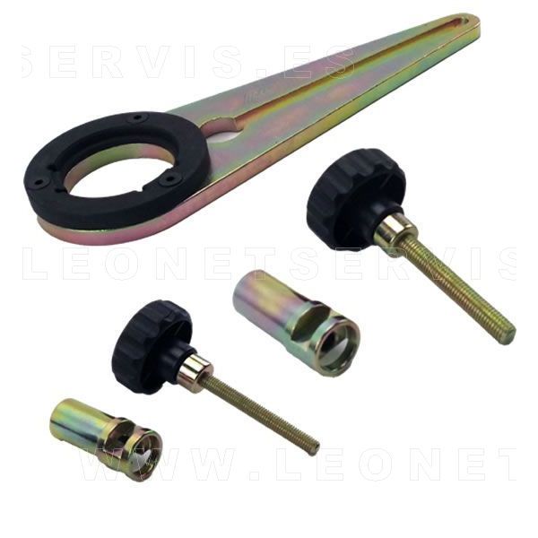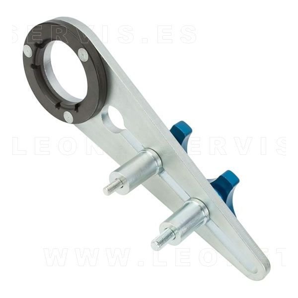 Herramienta para mantener fija la polea del cigüeñal mientras se aflojan o aprietan los tornillos centrales de la misma.