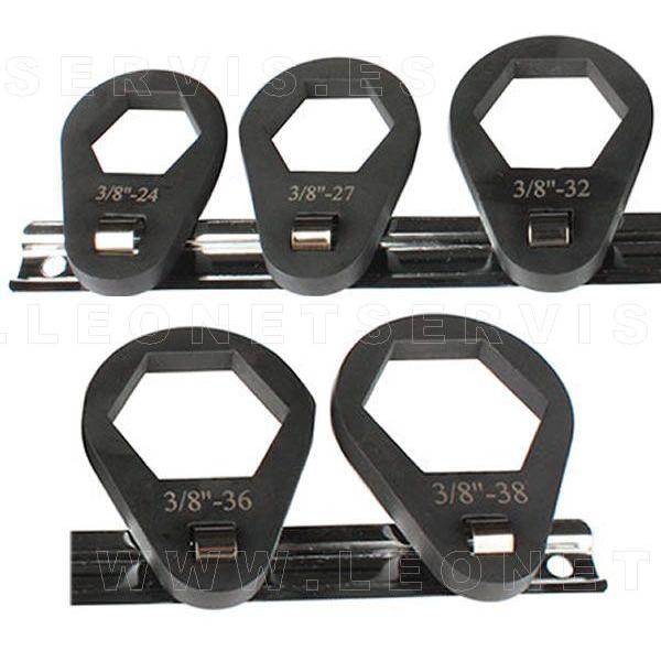 Juego de 5 piezas en las que se incluyen llaves de filtros de 25 a 38 mm para cuadradillo de 3/8". Se suministran en un rail metálico. Adecuadas para trabajar en zonas de difícil acceso.