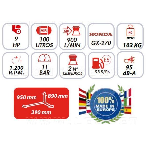 STRADE 90-100. Moto compresor de aire a gasolina 9 HP, 100 litros. Motor HONDA