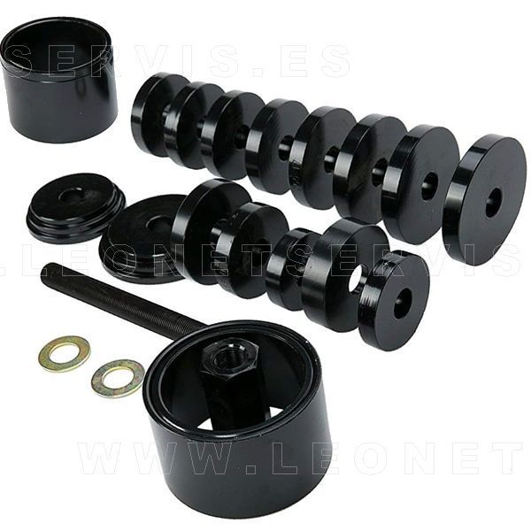El set incluye 11 discos para empujar rodamientos con diámetros de 50 a 88 mm, así como adaptadores y discos extractores de diferentes tamaños para garantizar compatibilidad con una amplia variedad de vehículos. Su sistema de trabajo permite un ajuste seguro y preciso, minimizando riesgos y asegurando una instalación adecuada.