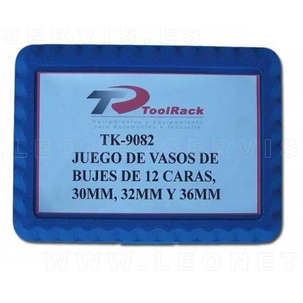 Conjunto de herramientas de taller que se utilizan en las distintas acciones a realizar sobre los bujes y provocan que se consiga en estas operaciones una mayor facilidad, seguridad y precisión en su ejecución.Al ser piezas con distintas medidas provoca que se puedan utilizar una u otra en función de las necesidades de cada vehículo.El juego de vasos está formado por 3 distintos que tienen las siguientes medidas: 30, 32 y 36 mm respectivamente.