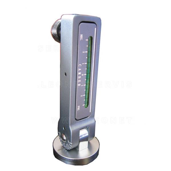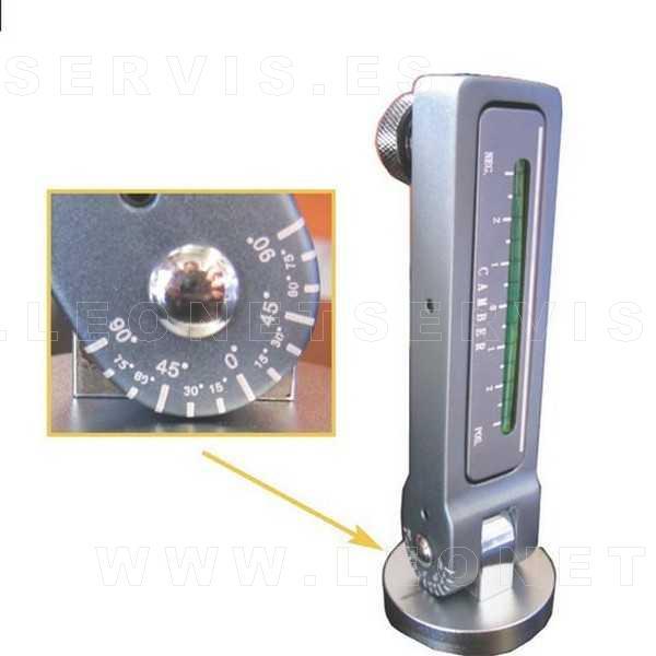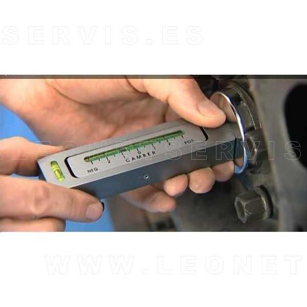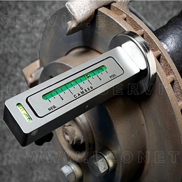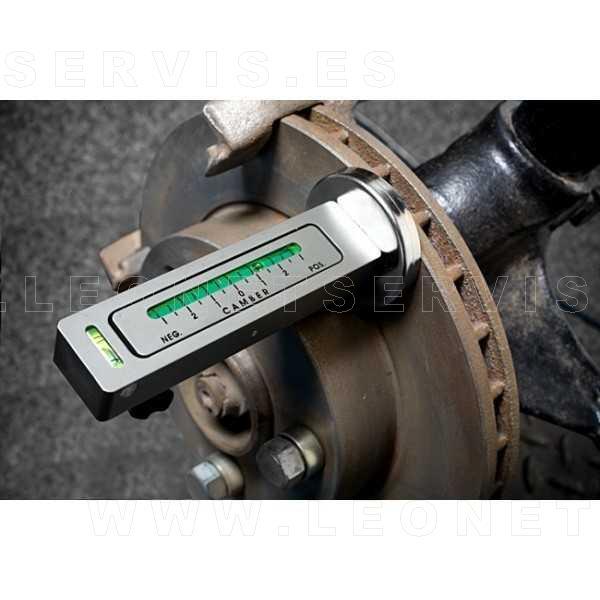 Herramienta de taller que tiene la consideración de nivelador de caída de ruedas, ajuste de 6º a -6º. Dispone de un pie magnético y se monta en el disco de freno para tomar los valores de caídas existentes antes de desmontar las patas de los amortiguadores. Una vez montadas las mismas, se realiza el reglaje de caída al valor determinado anteriormente.