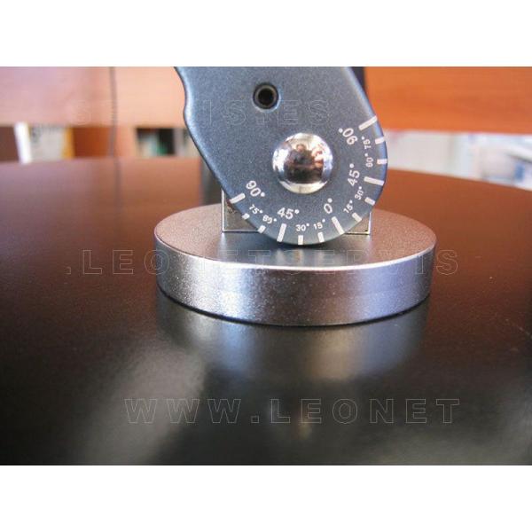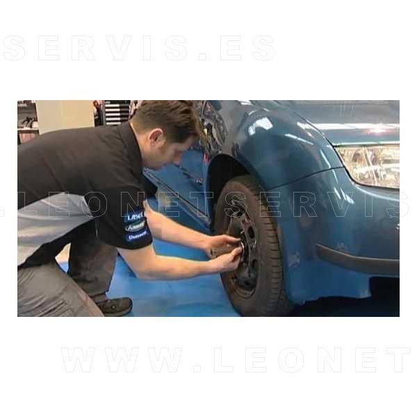 coloca en el disco de freno antes de desmontar el amortiguador y se memoriza el ángulo moviendo la rueda del útil hasta que la burbuja indica “0”, una vez sustituido el amortiguador solo se tiene que ajustar la caída hasta que el nivel indique “0”, de forma que nos aseguramos que la caída es la misma que antes