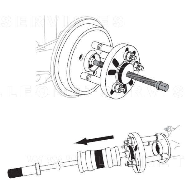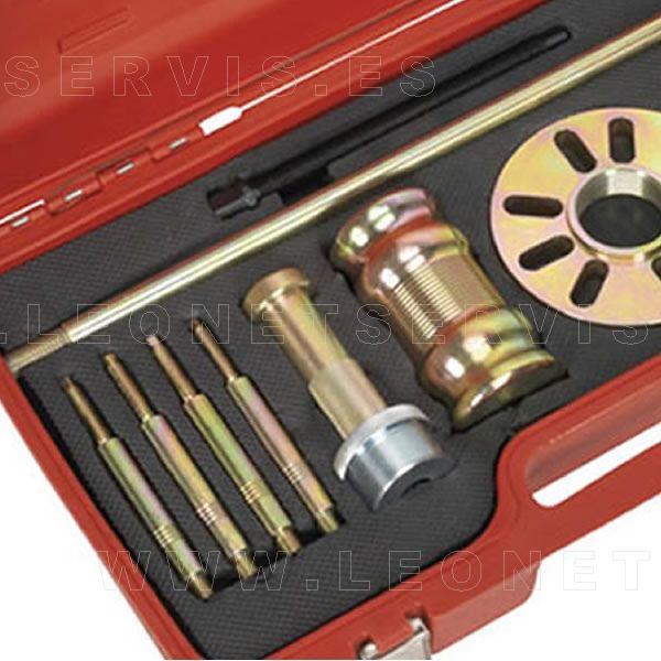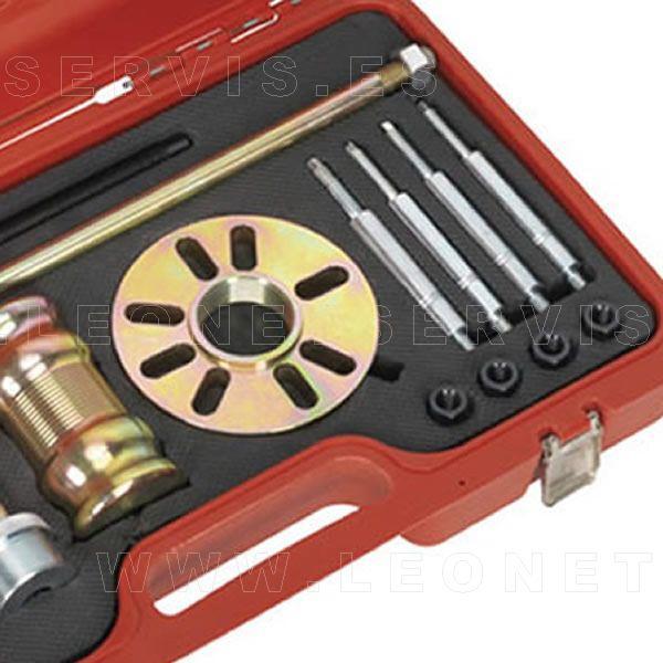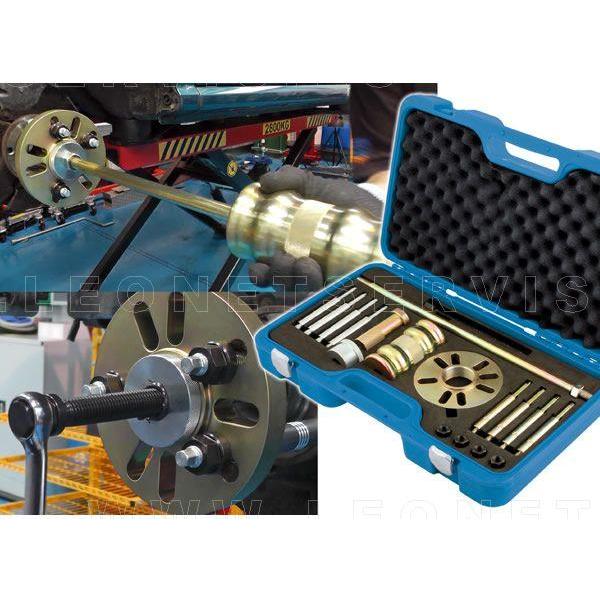 Los bujes son una de las piezas más empleadas en automoción jugando un papel importante en la convergencia de elementos móviles.Por este motivo, una herramienta para facilitar su extracción resulta imprescindible para cualquier taller mecánico o para los aficionados del motor.Los diferentes elementos y accesorios que componen este utillaje están especialmente diseñados para la extracción de bujes de cuatro o cinco pernos y tambores de frenos.Mediante el empleo del útil adecuado y el sistema de golpeo, esta herramienta permite de manera sencilla la extracción de piezas de automóviles y vehículos comerciales ligeros.Incluye martillo deslizante con un peso de 4,3 Kg. y un recorrido de 340 mm, lo que facilita la extracción de piezas atascadas.Otros accesorios que componen el Kit son: un tornillo de fuerza manual y dos tamaños de pernos: M12 x 1,5 y M14 x 1,5 mm.Se suministra en un práctico y cómodo maletín de transporte.