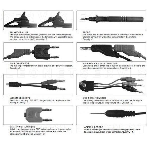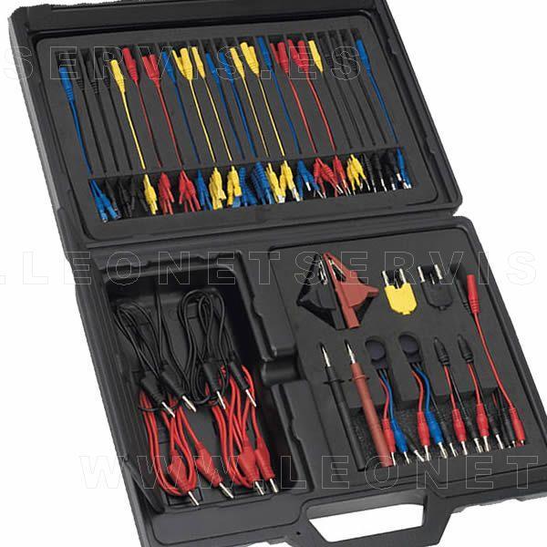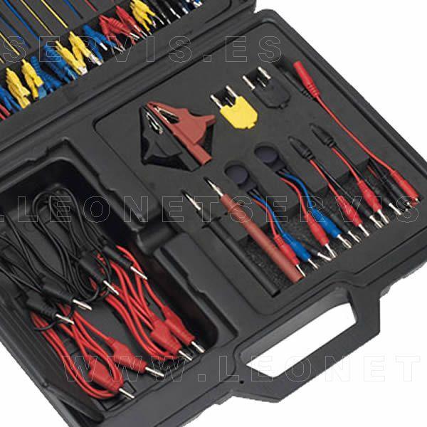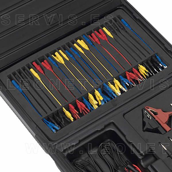 Conjunto completo formado por 90 piezas de cables y conectores con lo que se puede realizar de forma íntegra las comprobaciones eléctricas que sean pertinentes sobre el vehículo.
