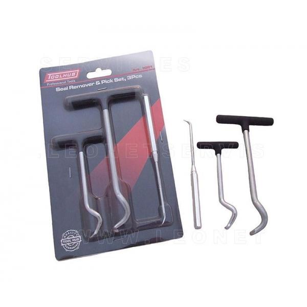 Conjunto de tres herramientas de taller diseñadas para extraer retenes y juntas sin causar daños en otros componentes.