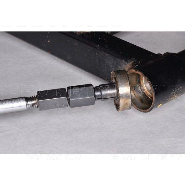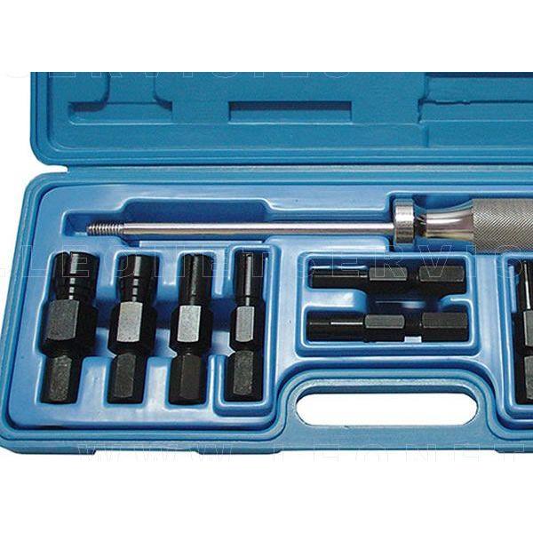 Completo kit de herramientas de taller diseñado para extraer rodamientos interiores que incluye un martillo deslizante y diez adaptadores diferentes las medidas: 8,10,12,15,17,20,25,30,32,35 mm