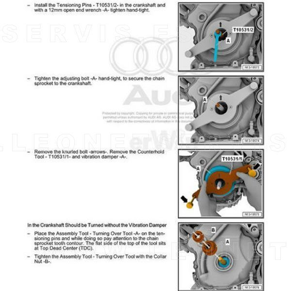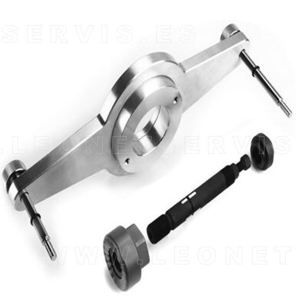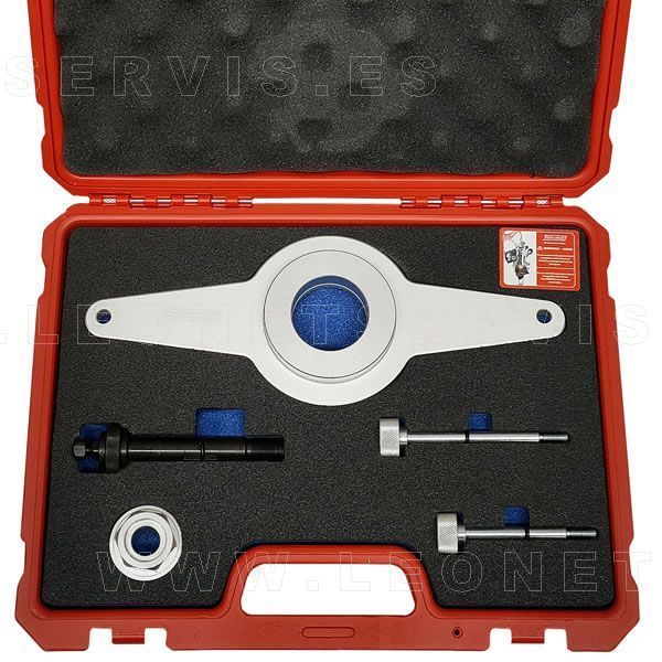 Este juego comleto de herramientas bloquea la rotación del piñón de la cadena de distribución al quitar o instalar el amortiguador de vibraciones (damper).