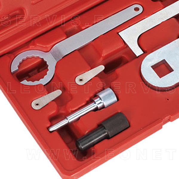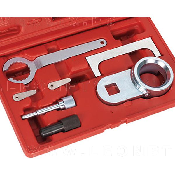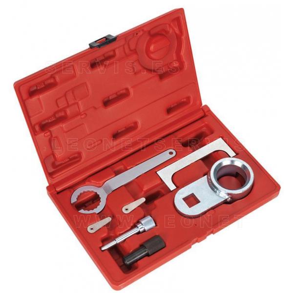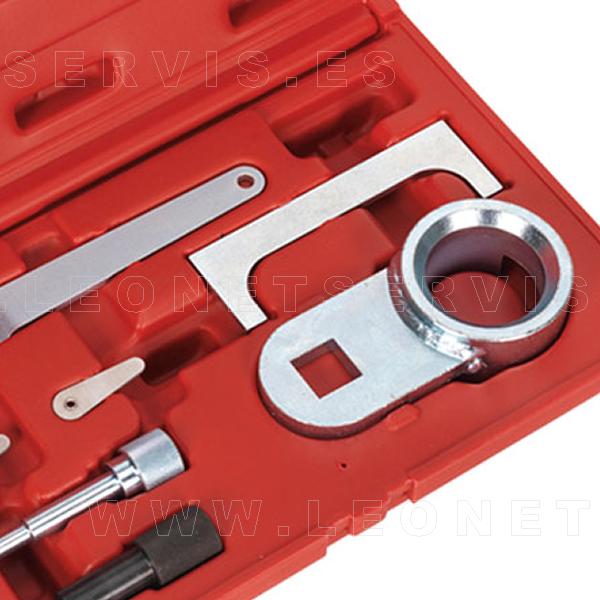 El kit incluye herramienta de la polea del cigüeñal, placa de ajuste del árbol de levas, bomba de inyección y pasadores de bloqueo del cigüeñal y el ajuste del tensor. Se suministra en un maletín para facilitar el almacenamiento de las distintas piezas.