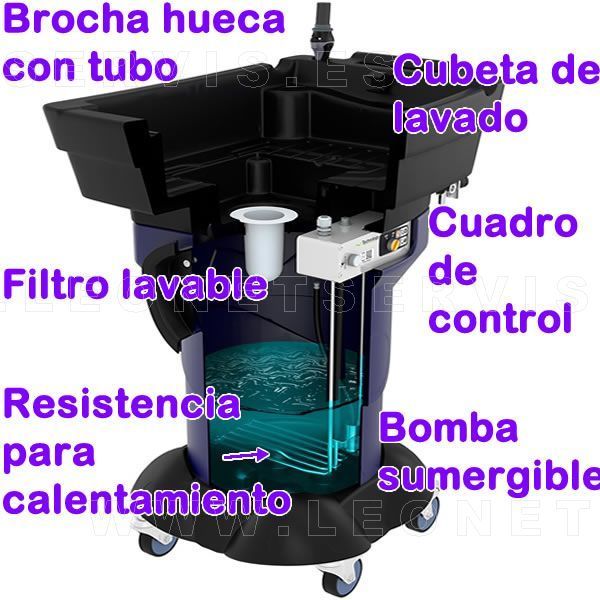 Además, la maquina de lavado dispone de un segundo interruptor On/Off para de calentar el liquido BlueLiquid® de lavado hasta 38º, lo cual aumenta la efectividad del producto especial limpiador y ayuda a un secado rápido de la pieza o parte lavada. Por supuesto dispone de dispositivo de segudidad contra el sobre calentamiento.