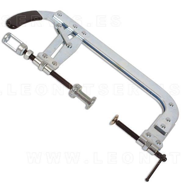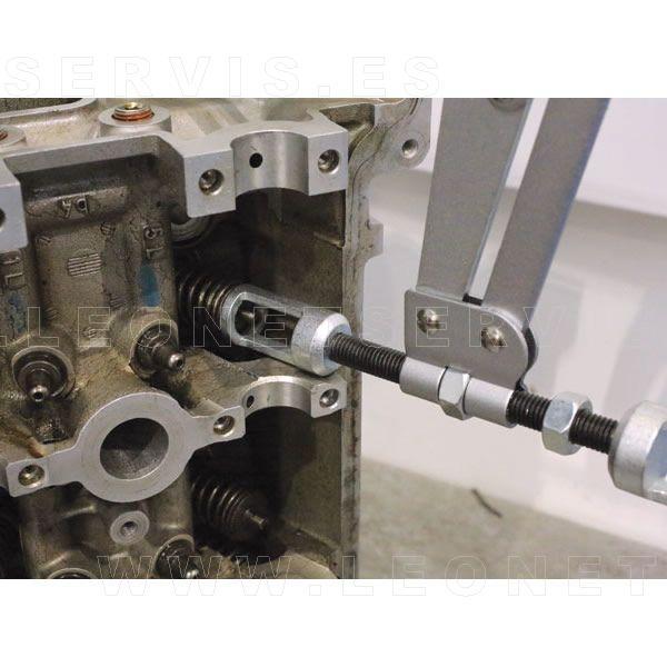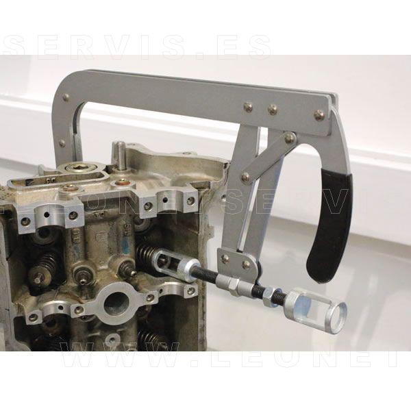 Compresor de muelles de válvulas, diseñado para permitir el reemplazo de resortes de válvulas y anillos de sellado de vástagos de válvulas en motores con árbol de levas en cabeza, sin quitar la culata.