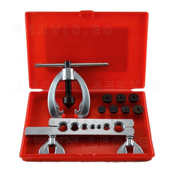 Conjunto de útiles necesarios para realizar las operaciones de extracción y otras relacionadas con los collarines de los tubos de frenos.Este kit incluye todo tipo de herramientas necesarias para hacer de manera más rápida, segura y eficaz las actividades que se han de realizar sobre esta parte de los frenos.Se suministra en un maletín donde se pueden reconocer perfectamente cada una de las piezas que forman el kit.