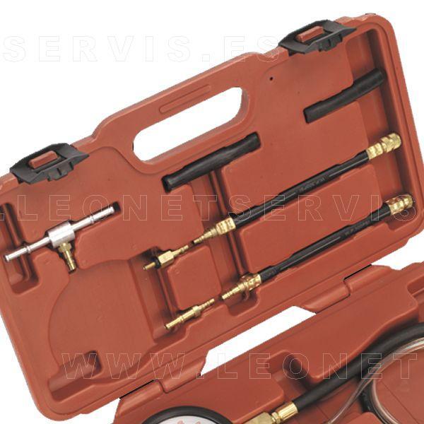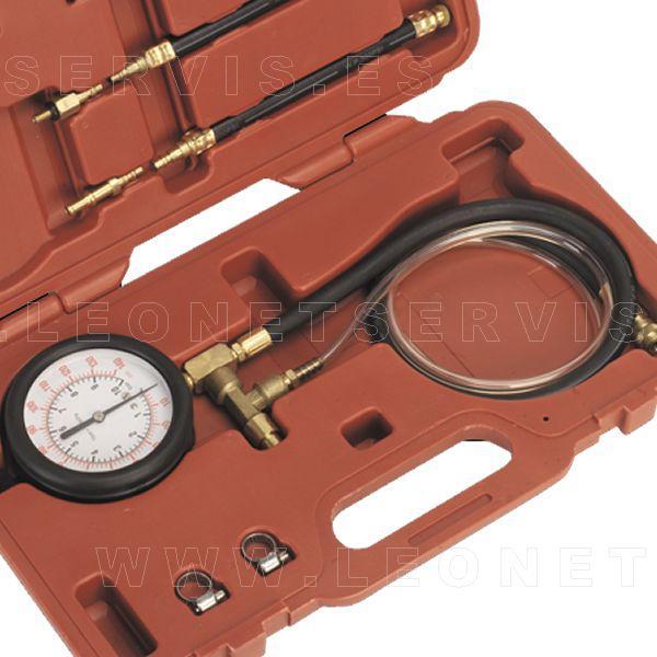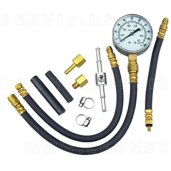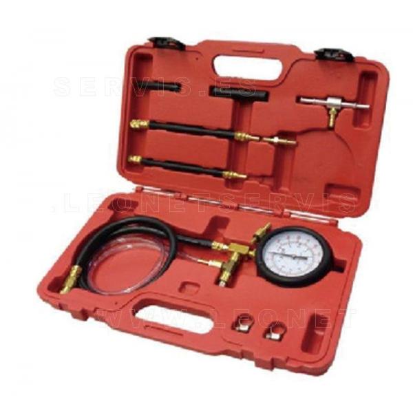 Instrumento que nos permitirá comprobar rápidamente la presión de la inyección en la mayoría de los sistemas de inyección de combustible. Incluye mangueras flexibles, accesorios de latón e instrucciones de referencia rápida y un manómetro que lee 0-100 PSI, de 0 a 7 bar.