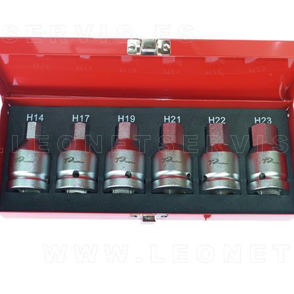 Conjunto de herramientas para vehículos industriales que está formado por un juego de 6 puntas Allen en vaso 3/4" que permiten adaptarse a cada uno de los diferentes tipos de vehículo en función de la punta a utilizar. Medidas: 14, 17, 19, 21, 22 y 23 mm