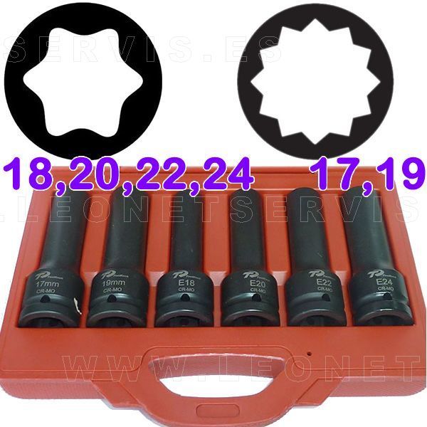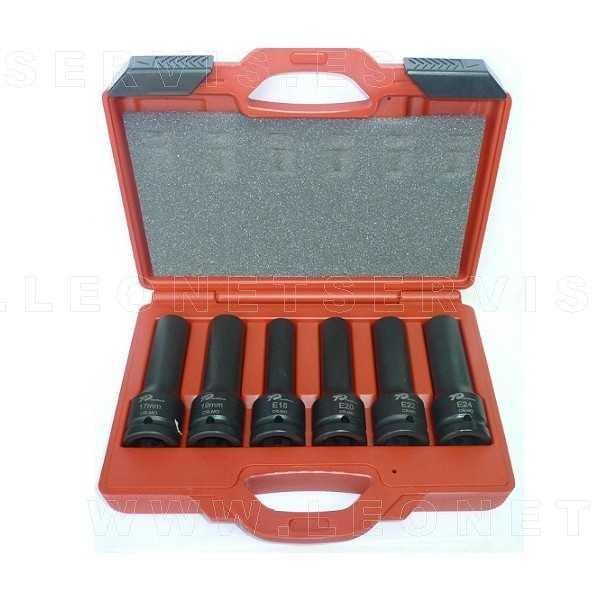 Juego de vasos largos de impacto Torx y 12 caras. 6 piezas. Cuadradillo de 3/4"