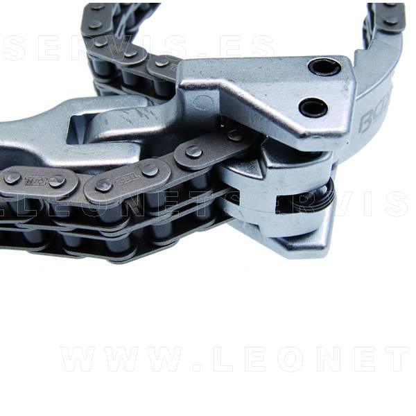 LLave de cadena adecuada para filtros de aceite de 60 a 160 mm. Largo de cadena 520 mm . Garra para evitar el deslizamiento de la cadena . Cadena de ancho aproximado. 22 mm. Asa cromada satinada