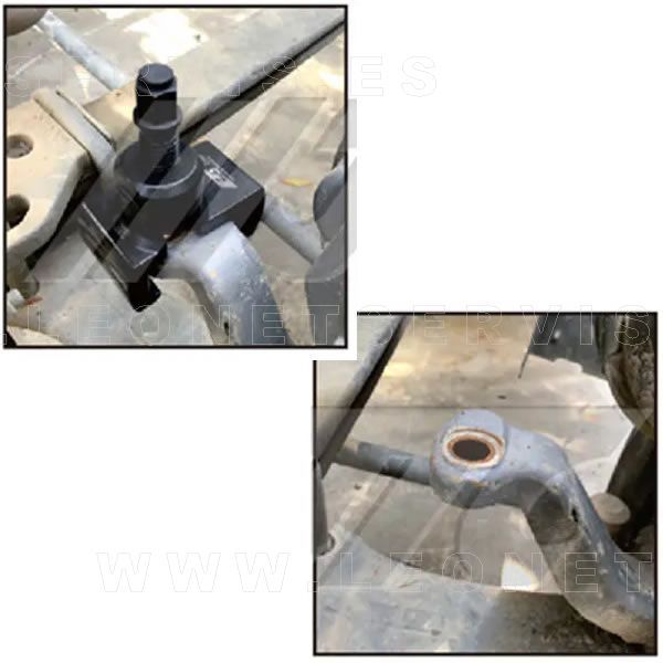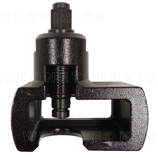 La forma especial de esta herramienta permite que se ajuste alrededor del brazo de enlace recto y permite que el tornillo de fuerza empuje sobre la rótula para separarla.