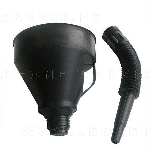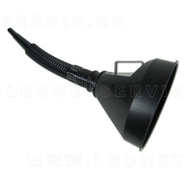 Se trata de un embudo fabricado en polietileno lo que le hace que sea resistente a líquidos como el aceite o el combustible e incluso también resiste algunos ácidos, por lo que le aplicable para muchas operaciones de taller. El cuello del embudo es flexible y las medidas son 140mm de boca y 290mm de cuello.
