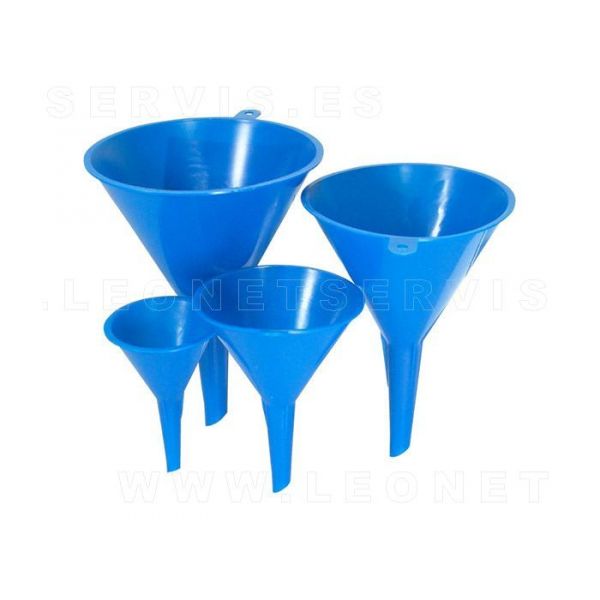 Conjunto de utiles de taller compuesto de 4 embudos de los siguientes tamaños: 50, 75, 100 y 125 mm. Perfectos para realizar las operaciones de trasvase de líquidos en nuestro taller.