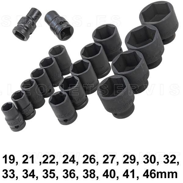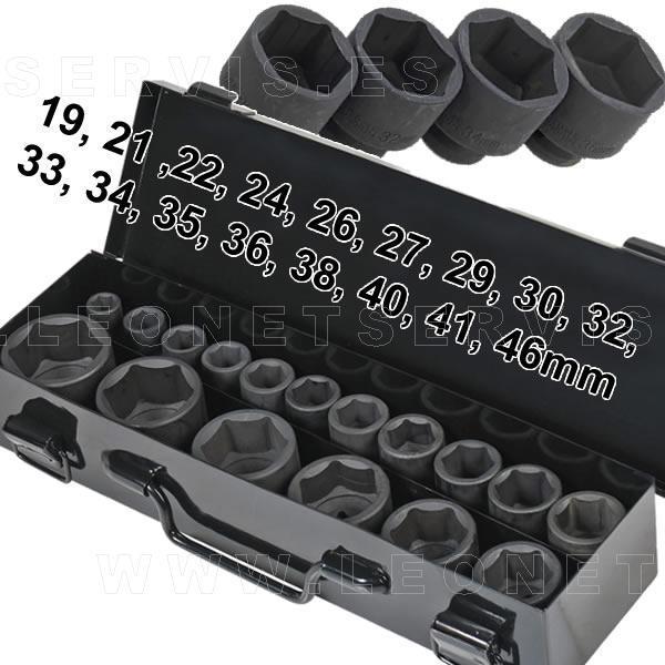 Juego de vasos de impacto cortos 3/4” DR – 6 caras, 17 piezas (19-46 mm) con estuche metálico