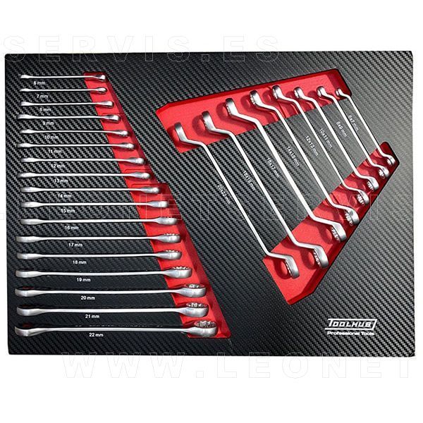 Módulo de llaves planas combinas y acodadas para carro de taller. Colocados sobre fondo de espuma goma EVA