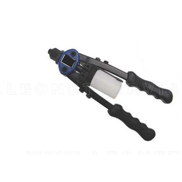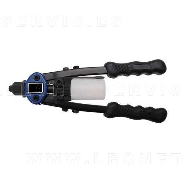 Remachadora manual de brazo largo equipada con bote recogedor de remaches. Sus asas de 220 mm permiten un fuerte apalancamiento. Adecuada para remaches de acero.