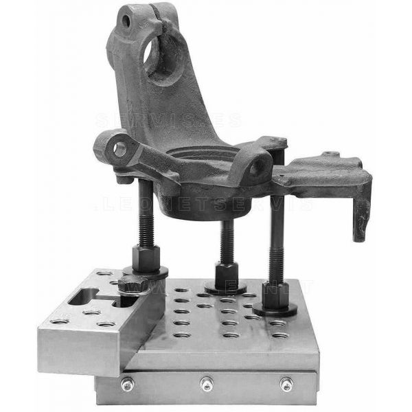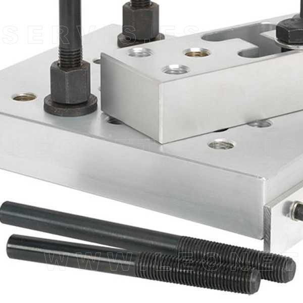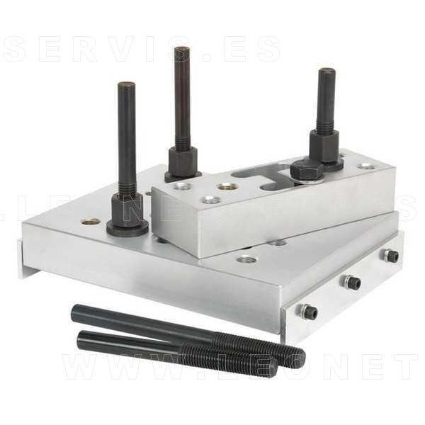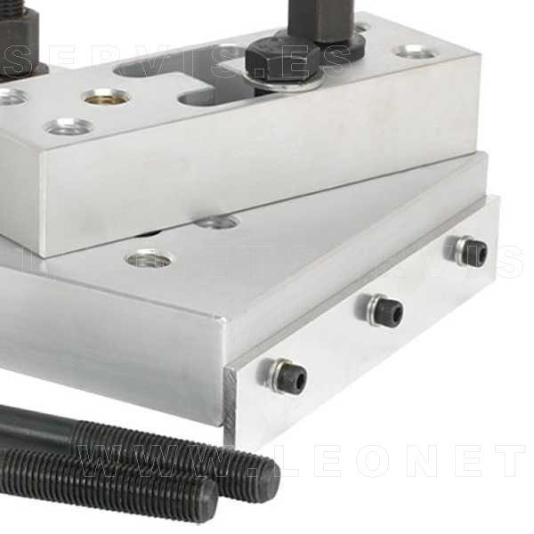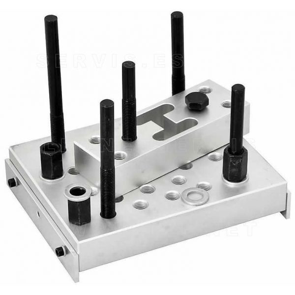 Soporte de aluminio para prensas. De uso universal. Asegura una robusta sujeción y apoyo. Se puede modificar y ajustar para muy diversos trabajos: extracción e instalación de rodamientos en los tirantes de suspensión, trapecios, bujes de ruedas, silentblocks, y otras partes con formas irregulares…