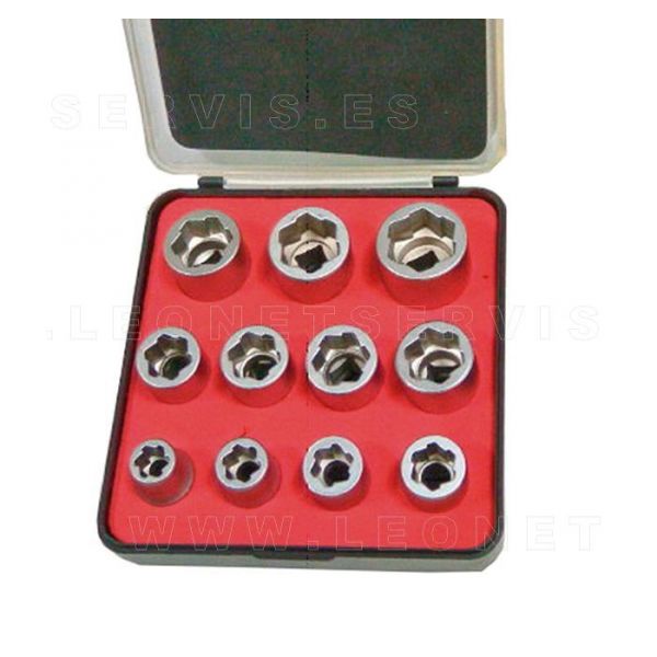 Conjunto de vasos que necesitan en las operaciones de extracción de tuercas dañadas que se adapten a la medida del vaso.El kit está formado por 11 piezas que tienen distinta medida para adaptarse a cada situación.Medidas: 8, 9, 10, 11, 12, 13, 14, 15, 16, 17 y 19 mm.
