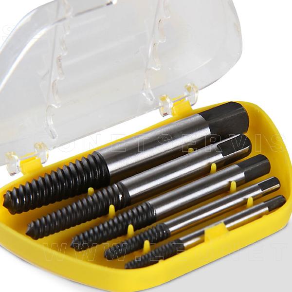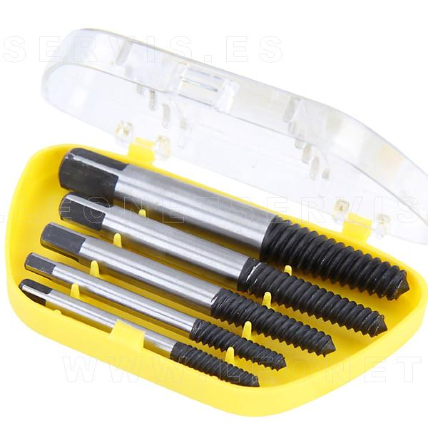 Juego de 6 piezas de extractores de tornillos suministrados en una práctica caja de plástico para facilitar su organización.