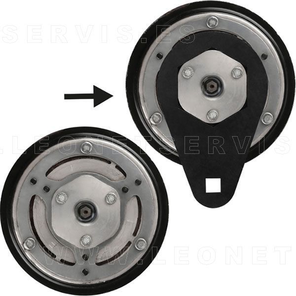 Herramienta de sujeción para polea de embrague del compresor de A/C. Diseñada para mantener la polea fija y permitir la extracción del tornillo de fijación.