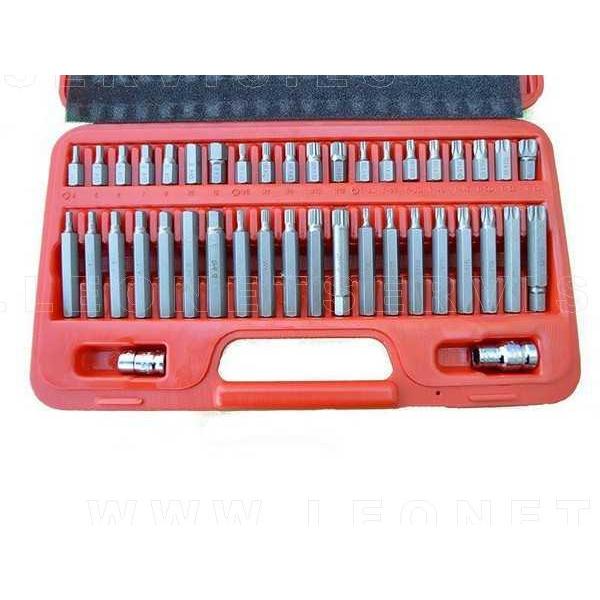 Completo kit de herramientas que incluye 42 puntas cortas y largas Torx, Allen, XZN. El kit incluye puntas de 30mm y de 75mm con las medias más utilizadas en el taller. Además el conjunto se suministra con adaptadores de 1/2" y 3/8" y en un maletín para facilitar su transporte y almacenaje.