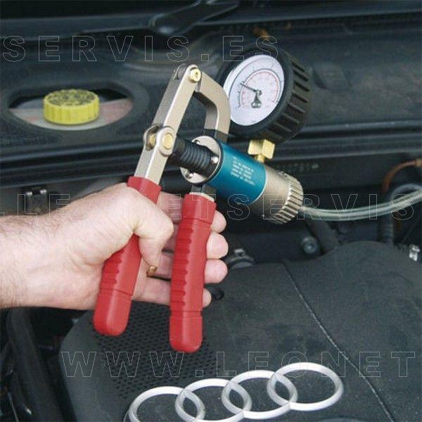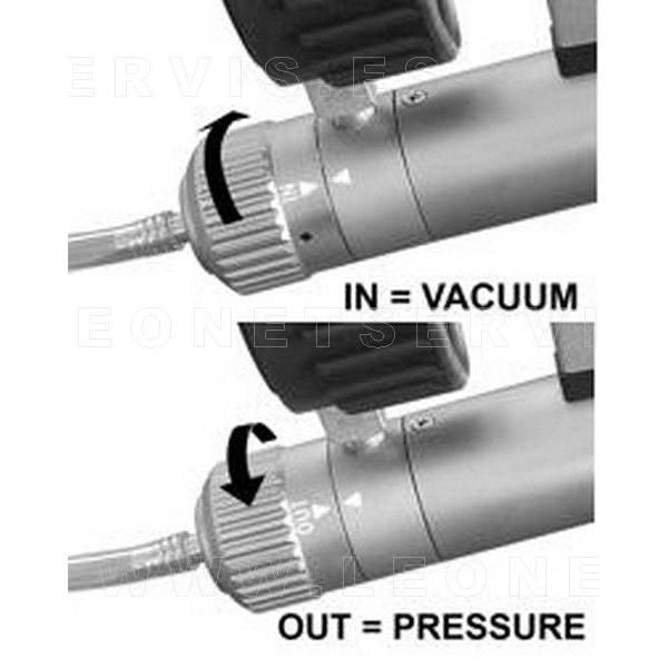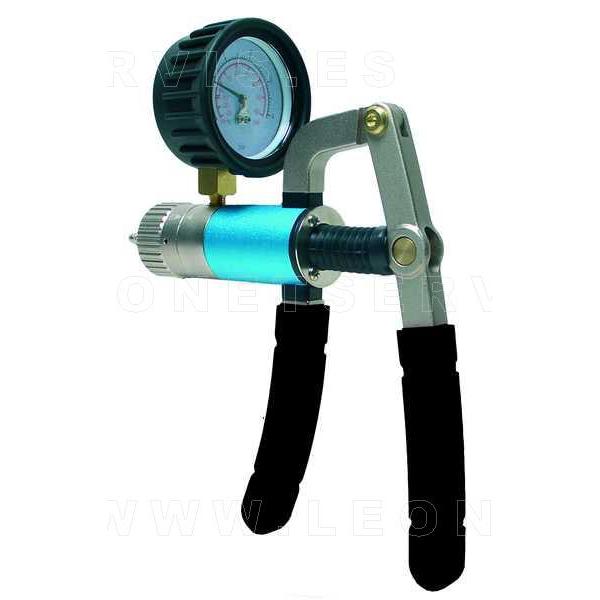 Bomba de vacío y presión construida en aluminio, reversible para la comprobación por vacío o por presión de los distintos componentes del vehículo. Construcción compacta de accionamiento manual. Mano-vacuómetro de alta calidad con un robusto protector de goma DS 63 mm (2 1/2”), escala dual de precisión con rango negativo de -1 a 0 bar y rango positivo de 0 a +3 bar/ 42 psi, escala de graduación 0.05 bar.
