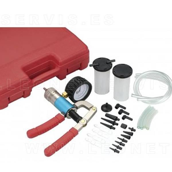 Vacuómetro que ayuda a identificar una variedad de problemas en los sistemas de los vehículos, tales como: combustible, encendido, transmisión, emisiones y A/A.Incluye accesorios para sangrar frenos y embragues.Bomba con función de presión/vacío. INCLUYE:Bomba de vacío 2 botes contenedor de fluido Mangueras de vacío; 1 x 65 mm, 2 x 80 mm, 2 x 600 mm, 19 conectores de diversas medidas