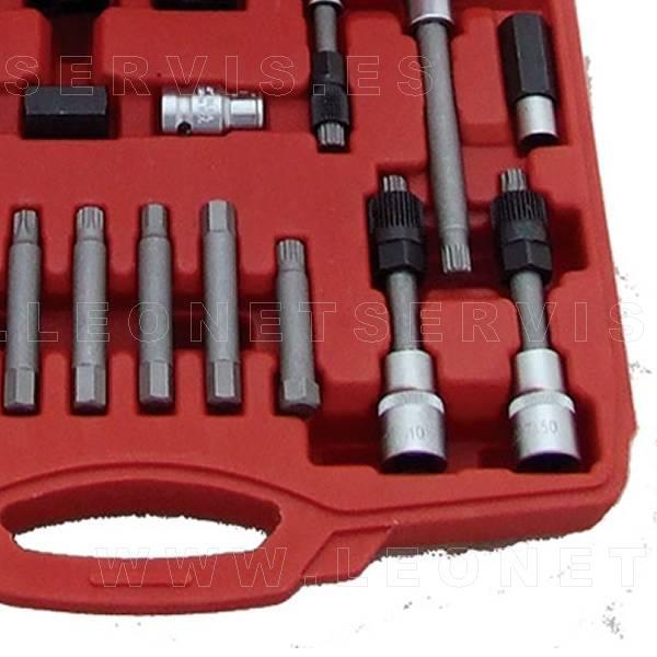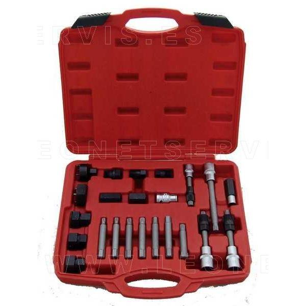 Juego de puntas especiales con llaves adecuadas para el trabajo de montaje y desmontaje de las poleas del alternador. Incluye adaptadores para principales marcas, Mercedes, BMW, Porsche, Opel, Toyota, Ford, VAG, Fiat, Renault, etc.