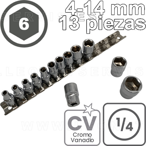 Conjunto de vasos CORTOS de 1/4", 6 caras. Acero CRV. 13 piezas de M4 a M14