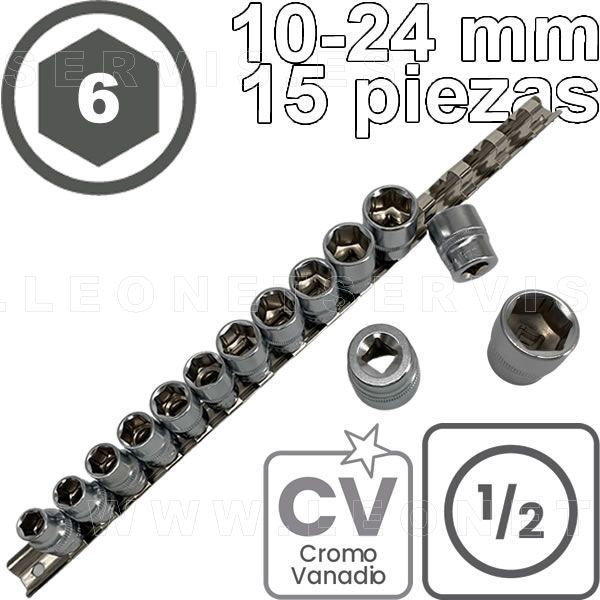 Conjunto de vasos LARGOS de 1/2", 6 caras. Acero CRV. 15 piezas de M10 a M24