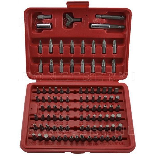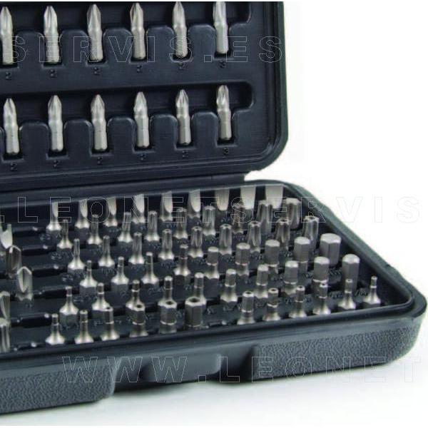 Completísimo juego de 100 puntas de todo tipo (Torx, Phillips, T-Star, hexagonales...). El kit incluye además varios adaptadores y un porta puntas. Con este kit podremos abarcar una gran cantidad de trabajos dada su versatilidad. Todo el conjunto se entrega en un maletín compacto para facilitar su transporte y almacenaje.