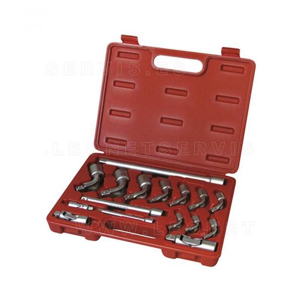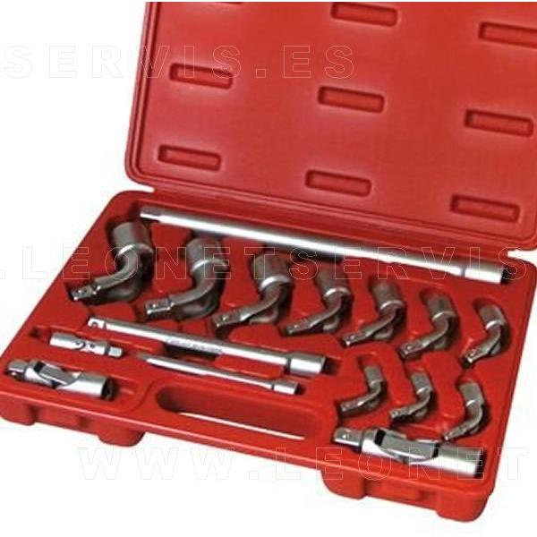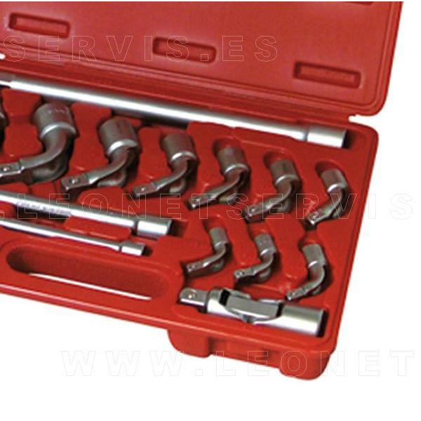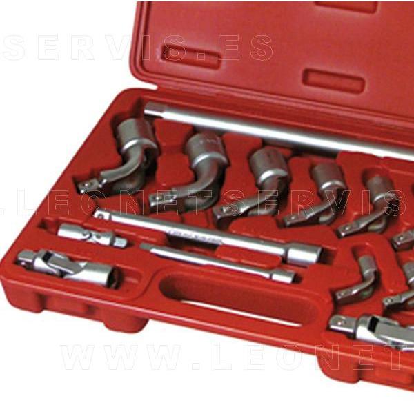 Este juego de vasos permite la diversificación del utillaje de taller.La característica principal de los vasos de pipa es su forma acodada, lo que facilita el trabajo sobre ciertas piezas y lugares específicos o de difícil acceso.El Kit contiene todos los accesorios necesarios para obtener el máximo rendimiento de la herramienta: vasos de diferentes medidas, barras de extensión y adaptadores.Se suministra en un práctico maletín para facilitar la conservación y la organización de las herramientas en el área de trabajo. El juego está formado por las siguientes piezas: